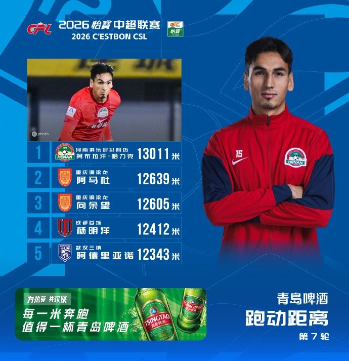在对青岛西海岸的比赛中,河南足球俱乐部阿布拉汗·哈力克跑动距离达到了13011米,成功排名本轮跑动距离榜首位。